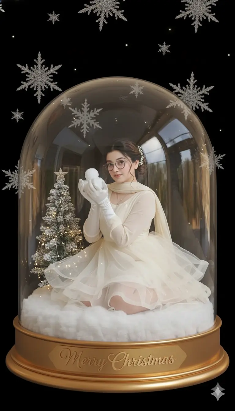 A soft, magical Christmas angel inside a crystal ball with snowballs and a frosted tree — created using the Gemini AI Crystal Ball Photo Prompt for Girls, giving a serene festive vibe.