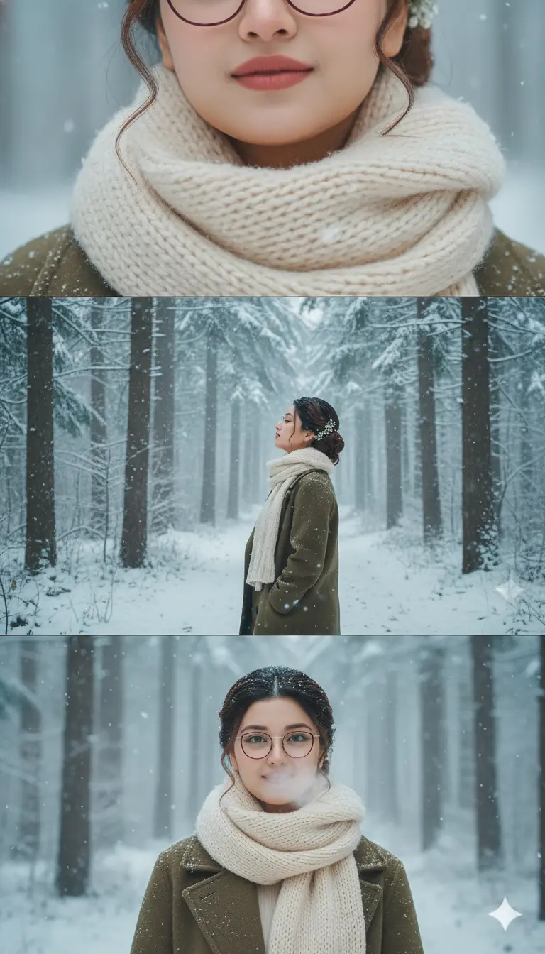 A soft winter portrait made using the Gemini 3 Layer Snowfall edit, showing a girl in a fur-hooded white jacket. The emotional close-up and full-body shots match the viral Google Gemini 3 Layer trend.